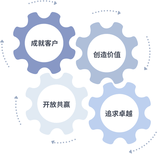 成就客户是一切决策的出发点,,,,创造价值是衡量所有工作的标准,,,追求卓越是我们做事做人的态度,,,,开放共赢是我们的格局也是最终的结果。。价值观的齿轮环环相扣,,,,推动着组织里的每个人不断向前。。。。